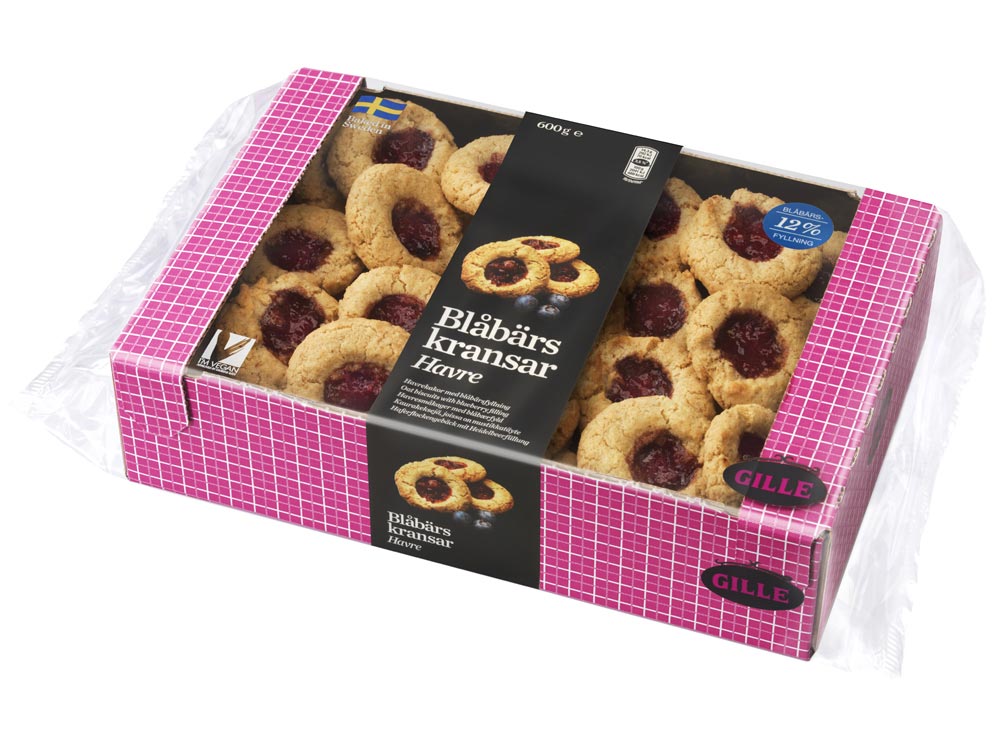 HAVREGRYN 31%, socker, vegetabiliska fetter (palm*, shea, kokos), blåbärsfyllning 12% (socker, vatten, blåbärspuré 10%, äppelkoncentrat, förtjockningsmedel: modifierad stärkelse (tapioka); geleringsmedel: pektin; surhetsreglerande medel: citronsyra; konserveringsmedel: kaliumsorbat; naturlig arom), VETEMJÖL, vatten, vegetabilisk olja (raps), bakpulver: natriumkarbonater; salt, emulgeringsmedel: mono- och diglycerider av vegetabiliska fettsyror; antioxidationsmedel: citronsyra; naturlig arom, mjölbehandlingsmedel: askorbinsyra.